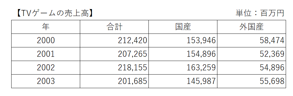 TVゲームの国産売上高について、2000年と比較した時、2003年はおよそ何%減少したか?